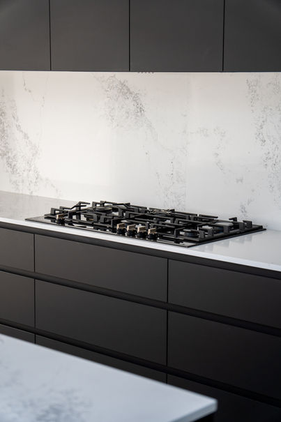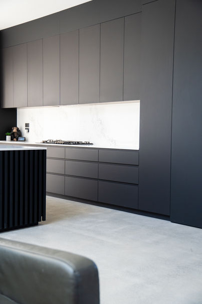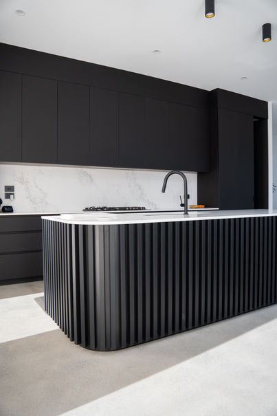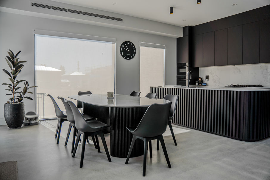 The gourmet kitchen is a masterpiece of modern design, featuring sleek black cabinetry, premium appliances, and a striking stone island bench. The open layout flows effortlessly into the adjacent dining area, making it ideal for hosting gatherings. Cleverly concealed storage and high-end finishes ensure the kitchen is both stylish and practical.