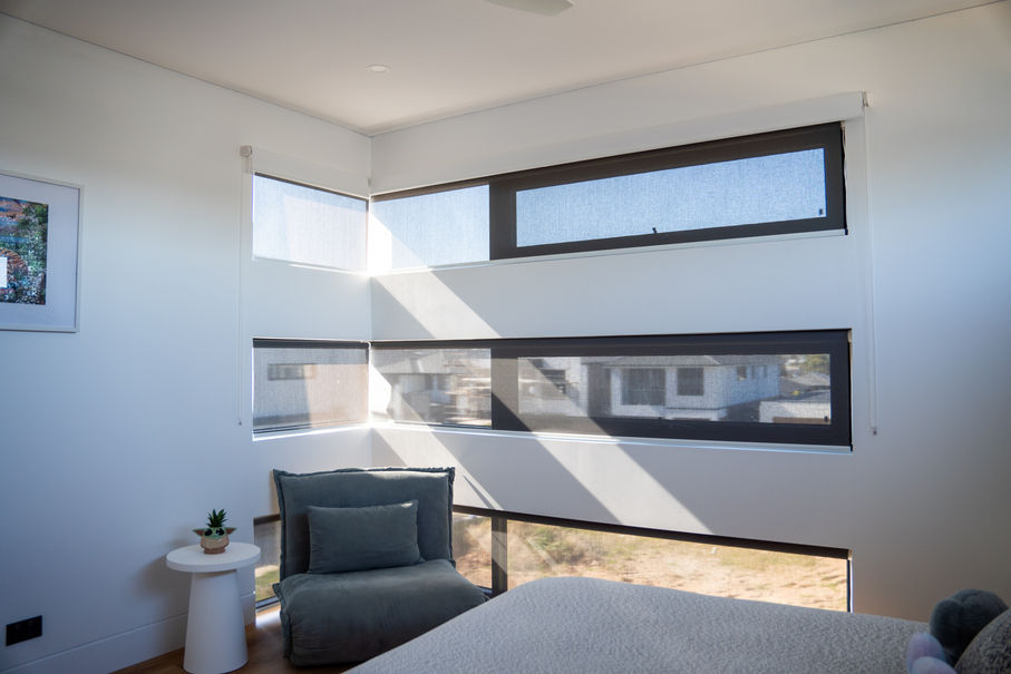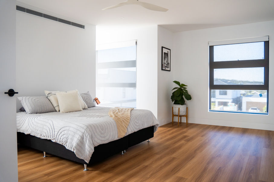 Upstairs, the home offers spacious bedrooms, each with large windows to draw in natural light. The master suite is a luxurious retreat, complete with a walk-in robe and ensuite featuring matte black fixtures, a walk-in shower, and a double vanity. The additional bedrooms share a modern family bathroom with similar high-end finishes and clean, minimalist detailing.