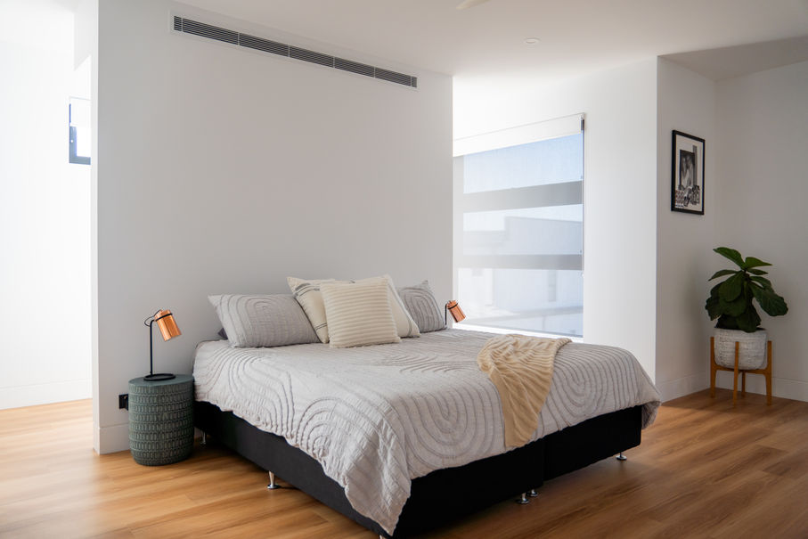 Step inside, and you’re greeted by a sophisticated palette of polished concrete flooring and black finishes, creating a seamless, high-end look. The design focuses on clean lines and open spaces, with a double-height void over the living area that floods the home with natural light from the rear. This design element enhances the sense of space and provides a visual connection between the two levels.