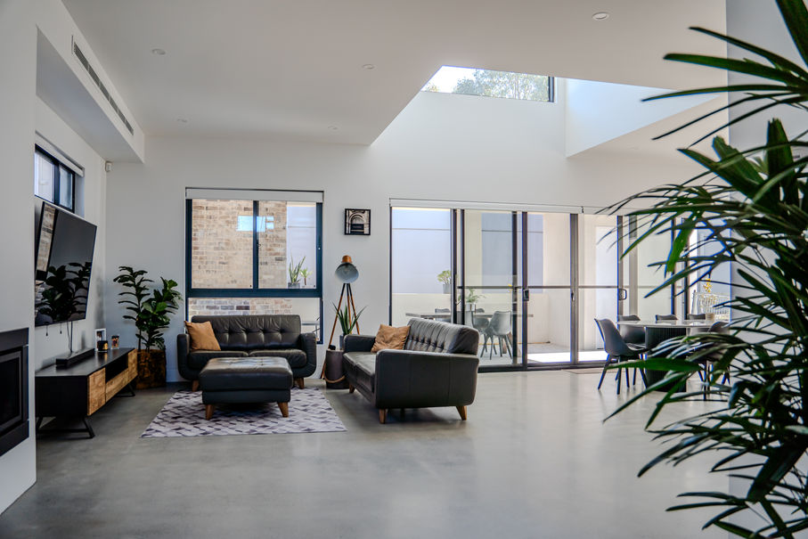 The open-plan living and dining areas are the heart of the home, designed for both relaxation and entertaining. The expansive living space benefits from the large void and floor-to-ceiling windows, creating a bright, airy environment that balances the sleek concrete and black detailing. A bespoke entertainment unit and custom joinery add functional elegance to the space.