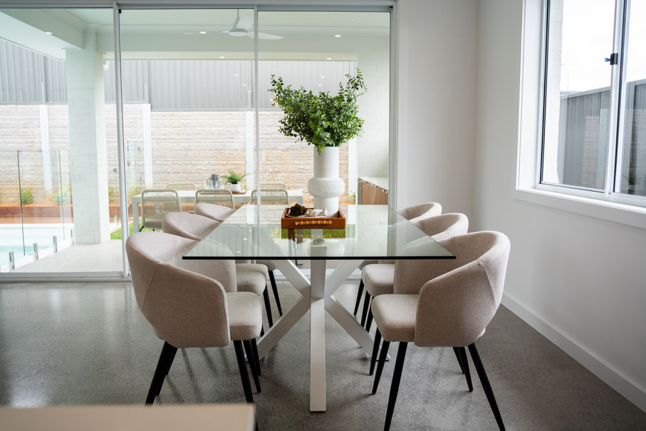 The open-plan living and dining areas are bright and spacious, thanks to large sliding glass doors that open onto the alfresco and pool area. These spaces are designed for modern family living, with clean lines and minimal clutter creating a sense of tranquillity and order.